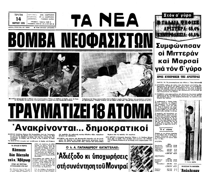 Βόμβα εκρήγνυται στον κινηματογράφο «Έλλη» της οδού Ακαδημίας, κατά τη διάρκεια της προβολής της σοβιετικής ταινίας «Ουράνιο Τόξο» του σκηνοθέτη Μαρκ Ντονσκόι. 18 θεατές τραυματίζονται, απ' τους οποίους οι τρεις πολύ σοβαρά. Η τρομοκρατική πράξη αποδίδεται στην ακροδεξιά.