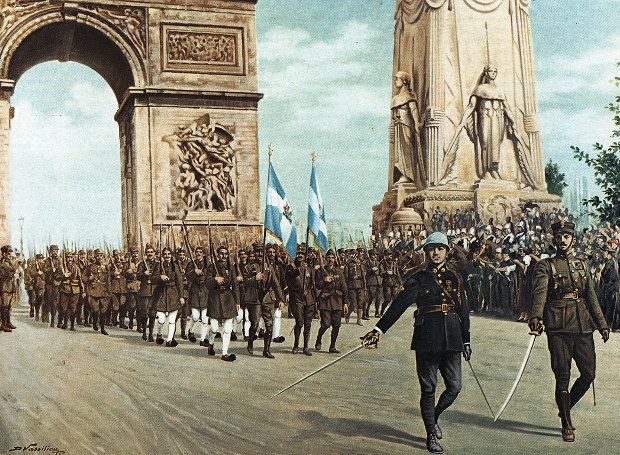 Ελληνικό στρατιωτικό τμήμα παρελαύνει τιμητικά στη Λεωφόρο των Ηλυσίων Πεδίων στο Παρίσι, κατά τον λαμπρό εορτασμό της νίκης των συμμάχων στον Α' Παγκόσμιο Πόλεμο.