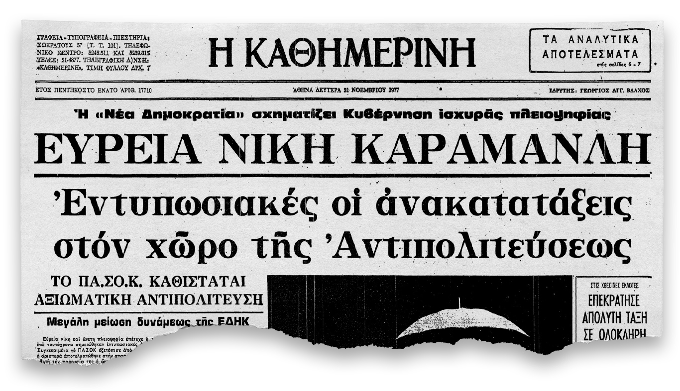 Η Νέα Δημοκρατία κερδίζει τις δεύτερες εκλογές της μεταπολίτευσης, με ποσοστό 41,85%. Το ΠΑΣΟΚ καθίσταται αξιωματική αντιπολίτευση με το 25,3% των ψήφων.