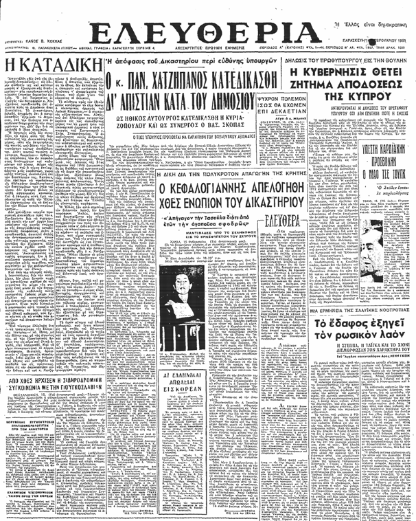 Η Βουλή των Ελλήνων παραπέμπει στο Ειδικό Δικαστήριο (Υπουργοδικείο) τον πρώην υπουργό Μεταφορών, Πάνο Χατζηπάνο, με την κατηγορία της απιστίας εις βάρος του Δημοσίου, σε σχέση με σκάνδαλο που αφορά τη μεταφορά καυσίμων. Η διαδικασία αποτελεί εφαρμογή του Συντάγματος περί πολιτικής ευθύνης υπουργών. Στις 15 Φεβρουαρίου 1951, ο Χατζηπάνος καταδικάζεται σε ποινή φυλάκισης δύο μηνών, με αναστολή τριών ετών, γεγονός που του επιτρέπει να παραμείνει ελεύθερος.