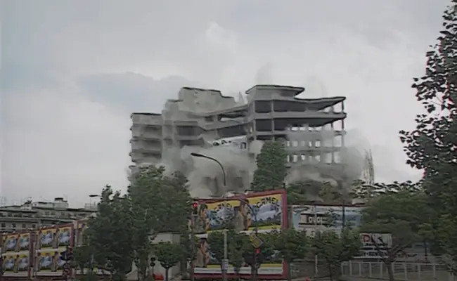 Πραγματοποιείται η πρώτη κατεδάφιση με δυναμίτη στην Ελλάδα, στο 15ώροφο και επί 30 χρόνια ημιτελές κτήριο του Ερυθρού Σταυρού, στη συμβολή των οδών Μεσογείων και Σλίμαν.
