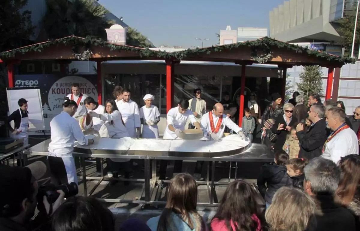 Ξεπερνά τα 300 κιλά το βάρος του γιγάντιου κουραμπιέ, που παρασκευάζεται και καταναλώνεται στο πάρκο του Αστερόκοσμου, στο Διεθνές Εκθεσιακό Κέντρο της Θεσσαλονίκης, διεκδικώντας μία θέση στο βιβλίο των ρεκόρ Γκίνες.