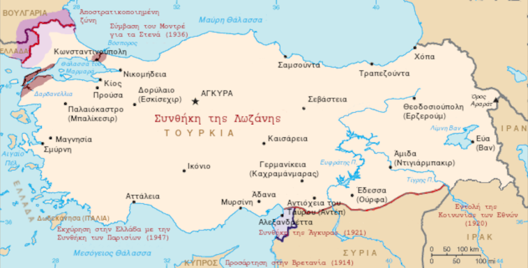 Υπογράφεται η Συνθήκη της Λωζάνης, που καθορίζει μεταξύ άλλων τα ελληνοτουρκικά σύνορα. Στη στεριά, το σύνορο των δύο χωρών είναι ο μέσος ρους του ποταμού Έβρου, εκτός από την εξέχουσα του Κάραγατς. Στη θάλασσα, αποδίδεται στην Ελλάδα κάθε νησί, νησίδα και βραχονησίδα, που βρίσκεται πέρα από τα τρία μίλια από τις μικρασιατικές ακτές, εκτός από την Δωδεκάνησο, το Καστελόριζο, την Ίμβρο και την Τένεδο.