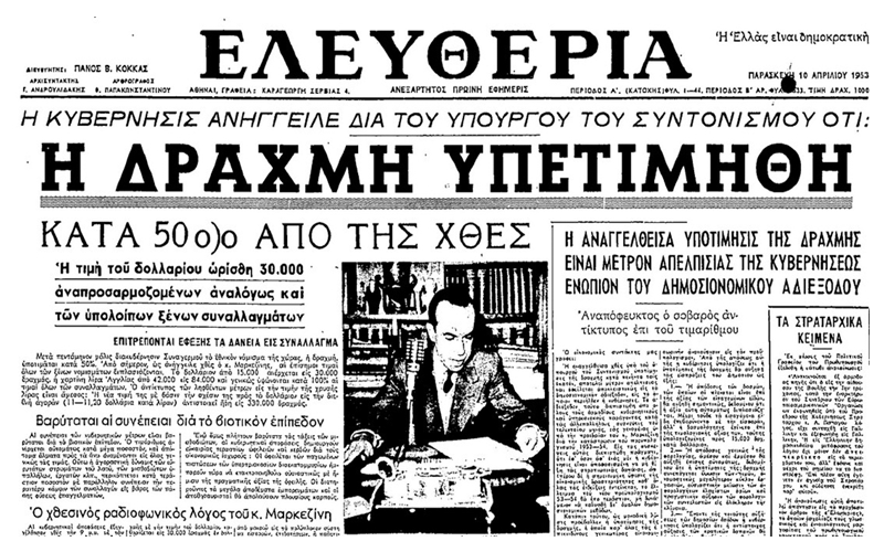 Ο υπουργός Οικονομίας της κυβέρνησης Αλέξανδρου Παπάγου, Σπύρος Μαρκεζίνης, υποτιμά αιφνιδιαστικά τη δραχμή έναντι του δολαρίου κατά 50%. Η παράτολμη αυτή ενέργεια θα αποδώσει, καθώς θα αυξηθούν οι εξαγωγές και ο τουρισμός, παρά τις περί του αντιθέτου προβλέψεις της αντιπολίτευσης.