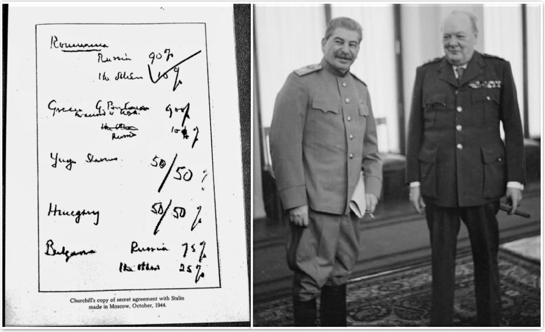 Κατά τη διάρκεια συνάντησης των Τσόρτσιλ και Στάλιν στη Μόσχα συμφωνείται να παραμείνει η Ελλάδα στη βρετανική σφαίρα επιρροής (Συμφωνία των Ποσοστών ή της Μόσχας). Το περιεχόμενο της συμφωνίας το αγνοεί η ελληνική πολιτική ηγεσία, αλλά και η ηγεσία του ΚΚΕ.