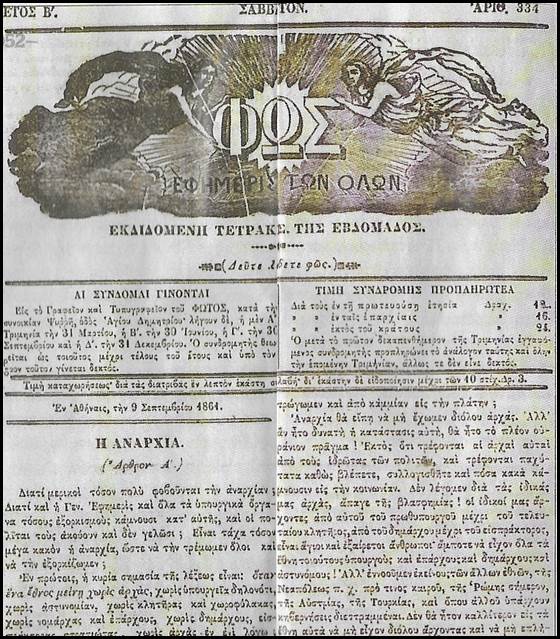 Το πρώτο μέρος του άρθρου «Aναρχία» δημοσιεύεται στην εφημερίδα «Φως» του Σοφοκλή Kαρύδη και θεωρείται το πρώτο αναρχικό δημοσίευμα στον τότε ελλαδικό χώρο. Ως συγγραφέας του φέρεται ο φοιτητής Νομικής Δημήτριος Παπαρρηγόπουλος, γιος του ιστορικού Κωνσταντίνου Παπαρρηγόπουλου. Η εφημερίδα διώκεται και το φύλλο κατάσχεται.